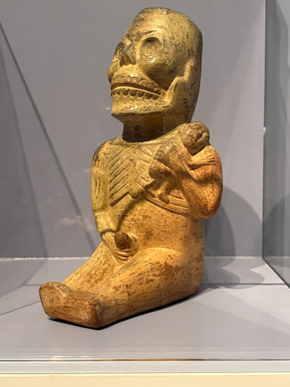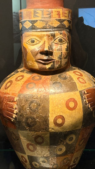 We visited Huaca Pucllana, a massive adobe pyramid complex located in central Miraflores. This pyramid has a very different scale than the ones you think of in Egypt. Built on seven staggered platforms from millions of adobe bricks, the size of a textbook, stacked in a bookshelf pattern for strength and earthquake resistance, it served as a ceremonial center and seat of power. Sacrifices were performed to favor the gods, and many graves were found throughout the site. Excavations have revealed that people were interred in tightly folded positions, with their artifacts, in multiple layers of textiles. Because of the arid climate, remains have been remarkably preserved over the centuries. Artifacts include ceramics, jewelry, and other offerings, giving a glimpse into the beliefs and practices of early Lima culture.